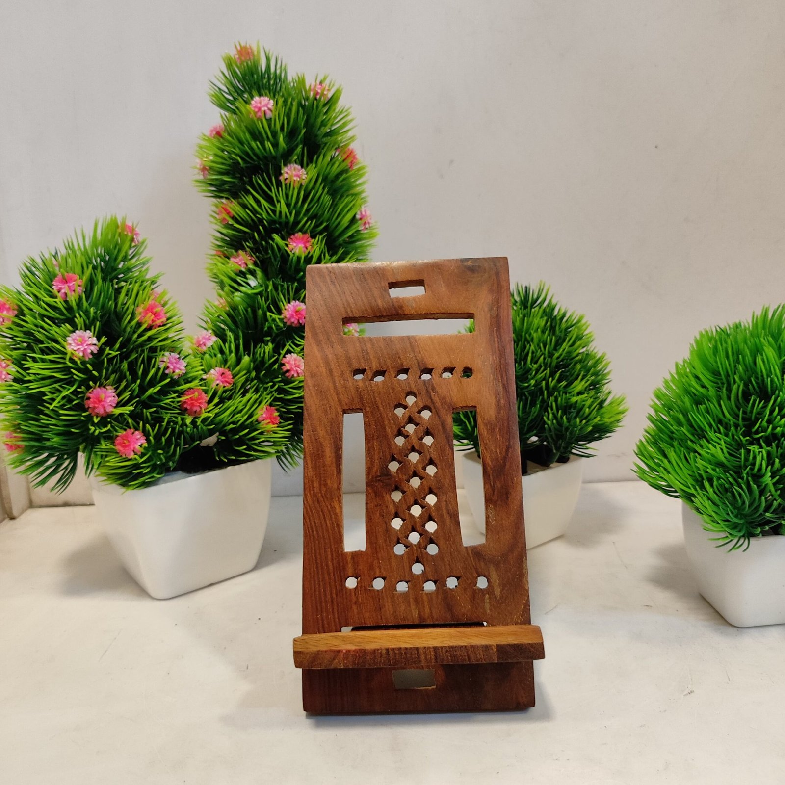 Enhance your mobile experience with this beautifully crafted wooden stand, blending practicality with timeless design.